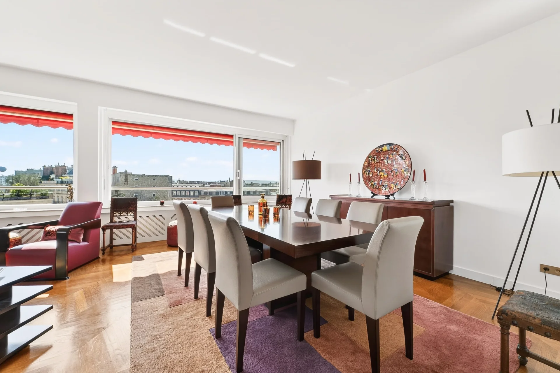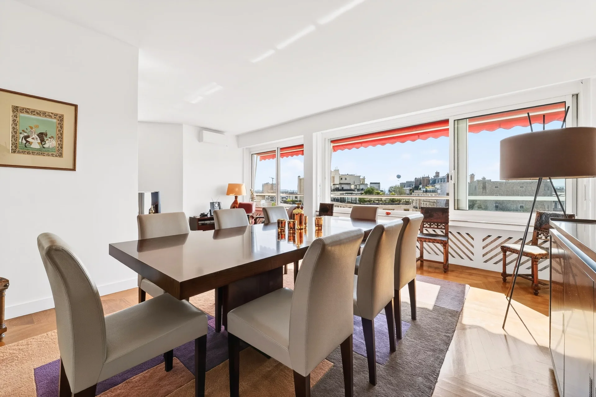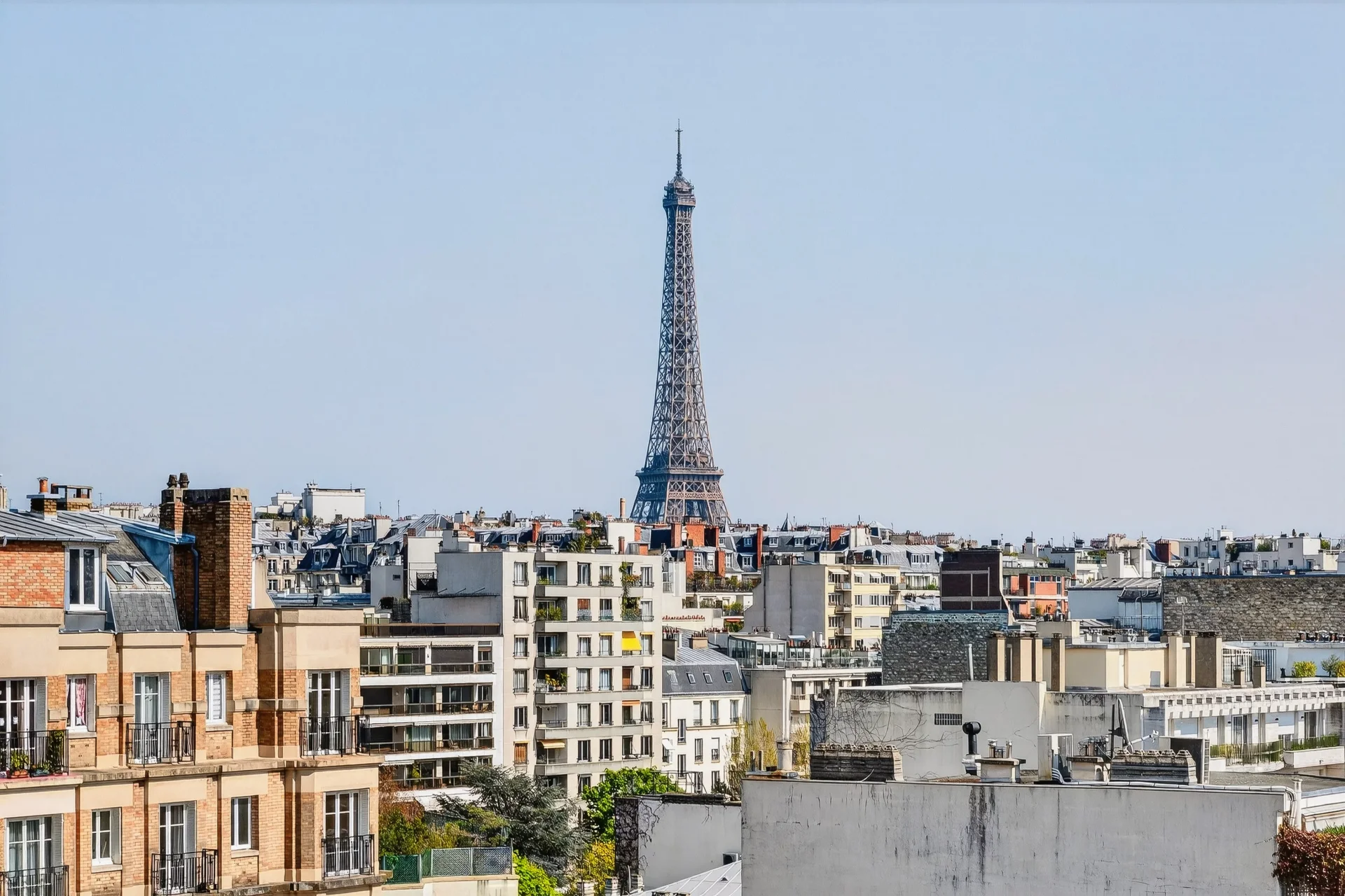 La partie salon ouvre sur un balcon terrasse de 10 mètres de long offrant une magnifique vue dégagée sur les toits de Paris et la tour Eiffel.