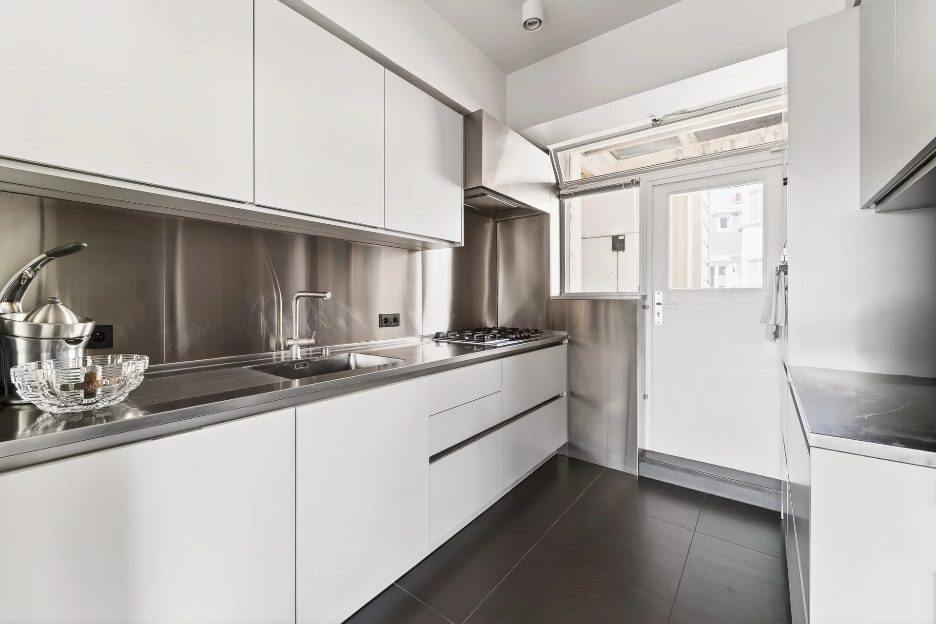 Une cuisine semi-ouverte dessert l'entrée de service avec son ascenseur.