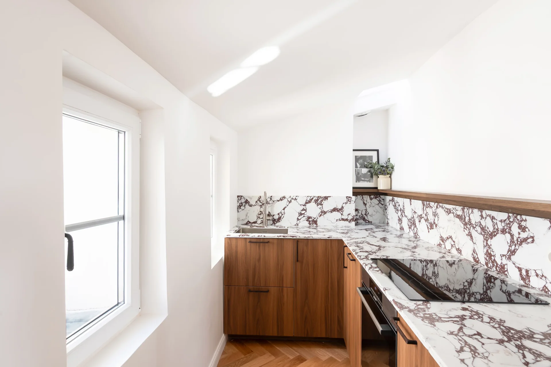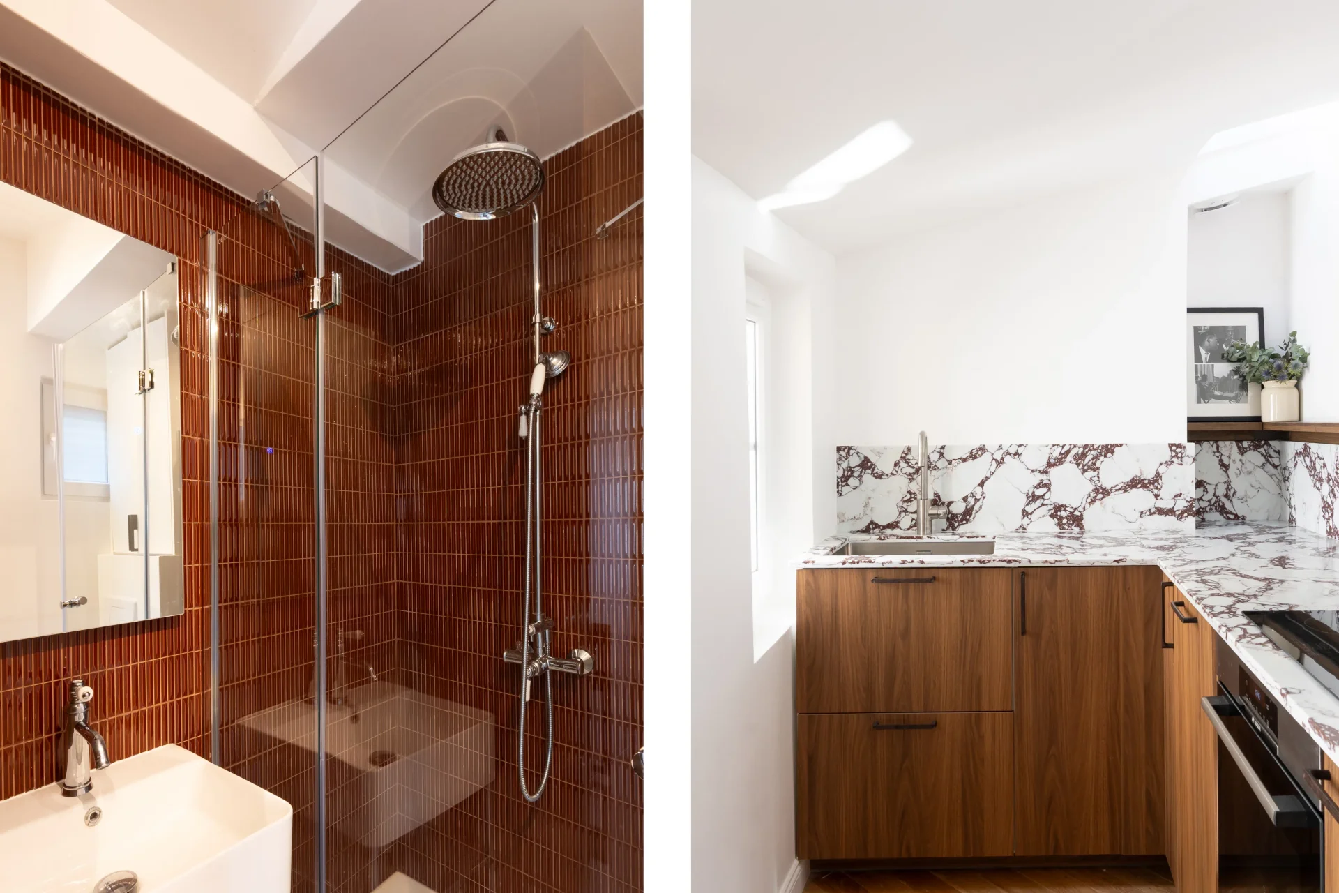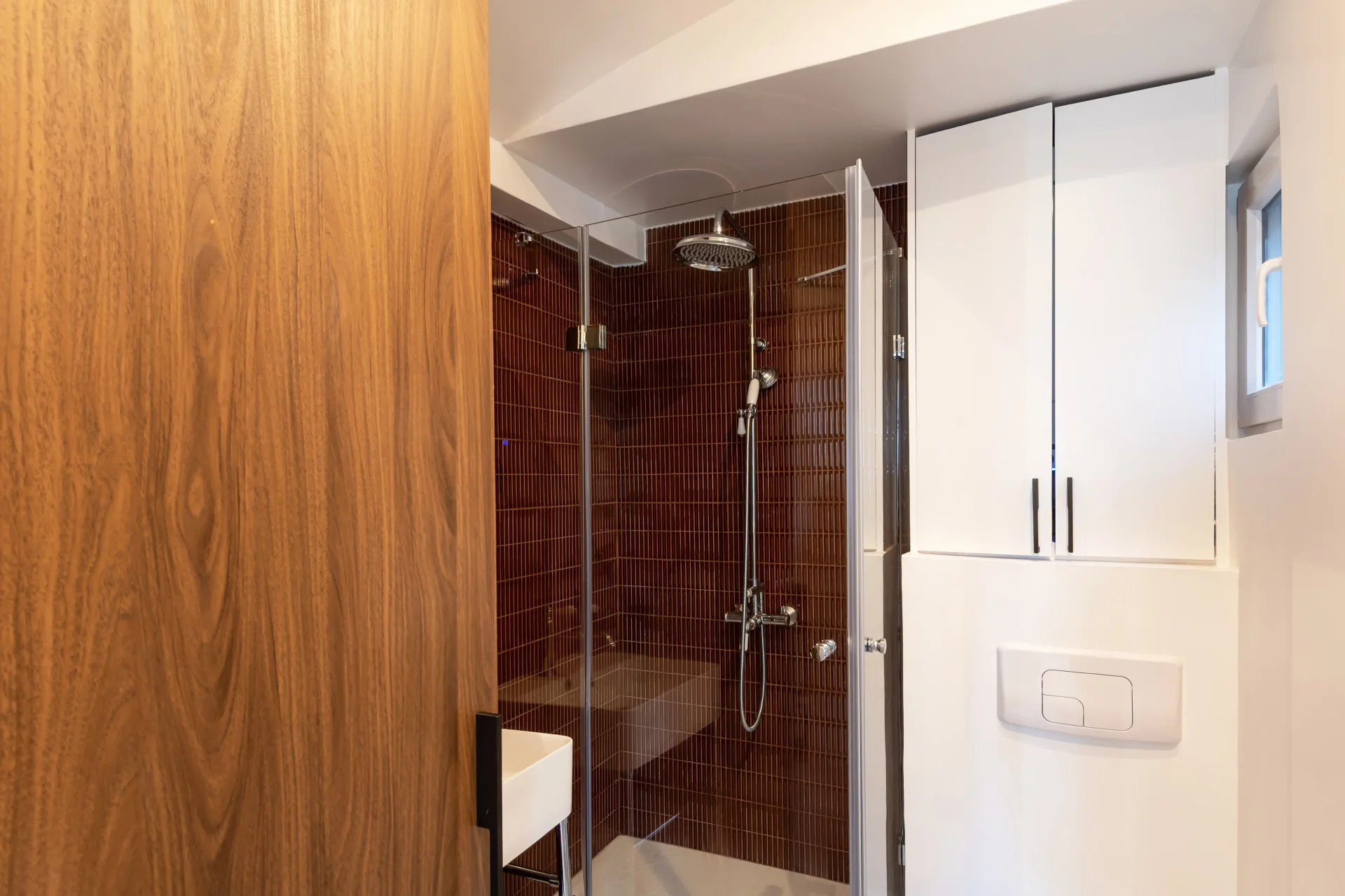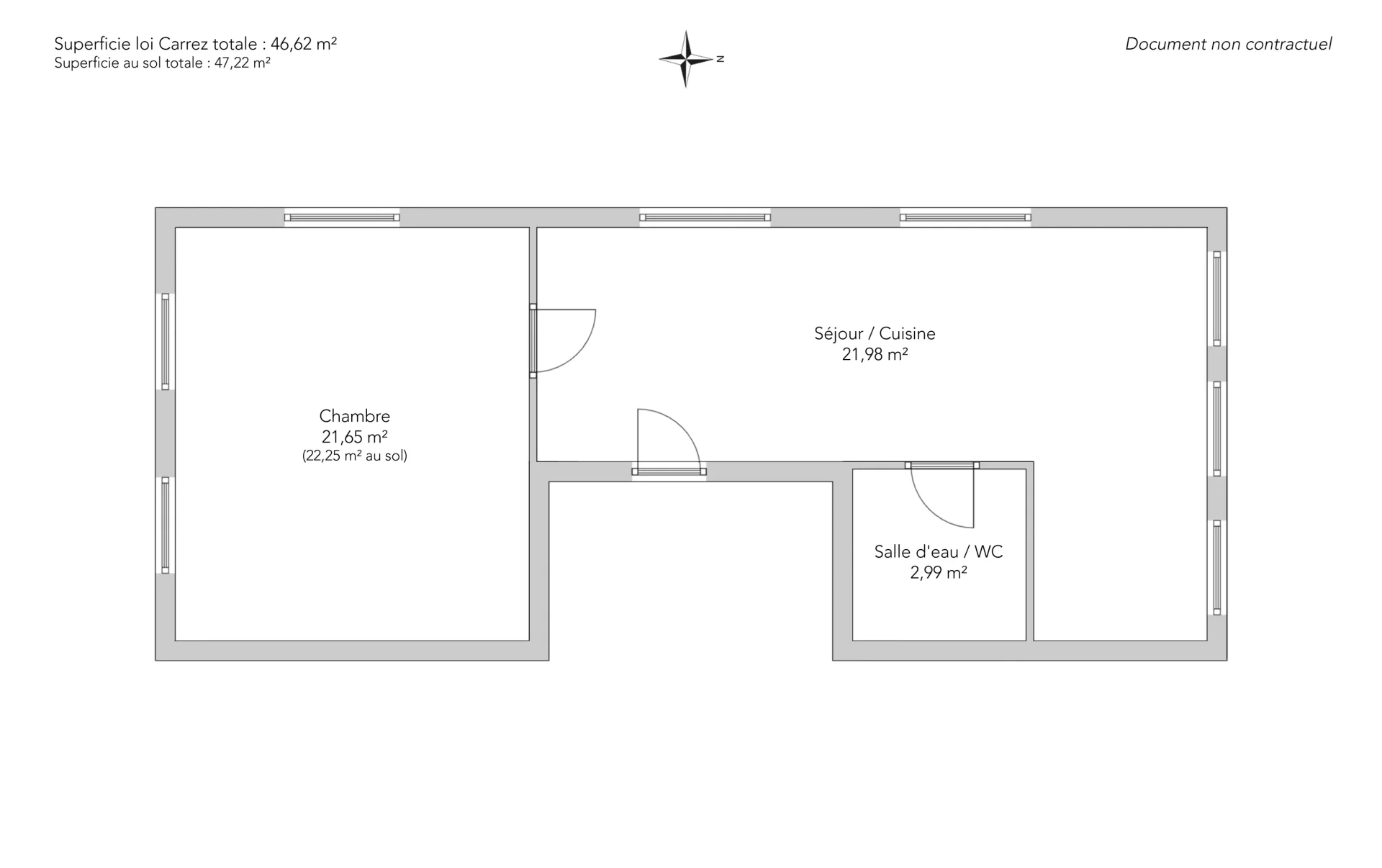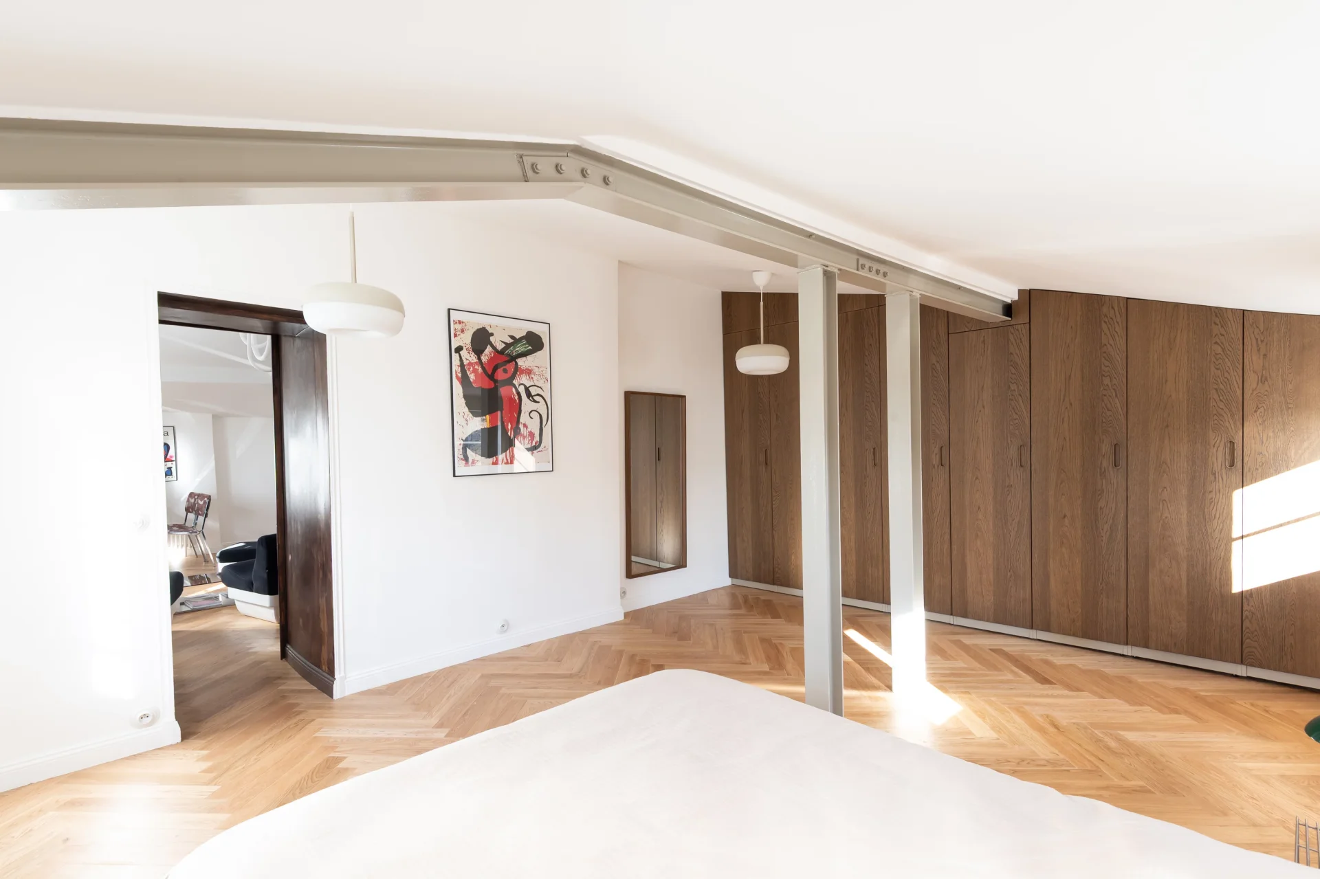 Il comprend un séjour exposé ouest, une cuisine ouverte, une chambre avec de nombreux rangements intégrés, une salle de douche avec toilettes. Baigné de lumière avec ses nombreuses ouvertures et doté de beaux volumes, cet appartement a fait l'objet d'une rénovation de qualité avec de beaux matériaux.
