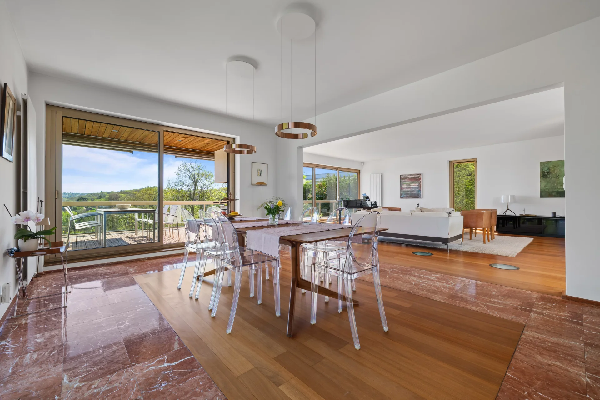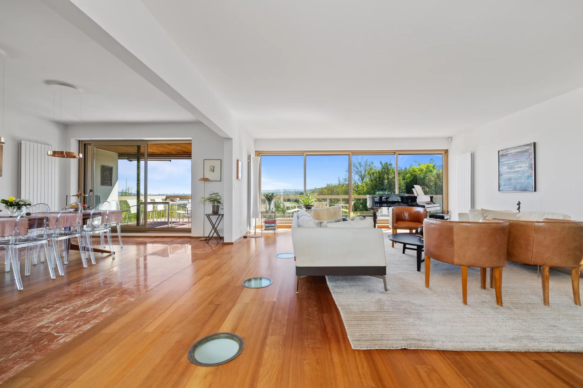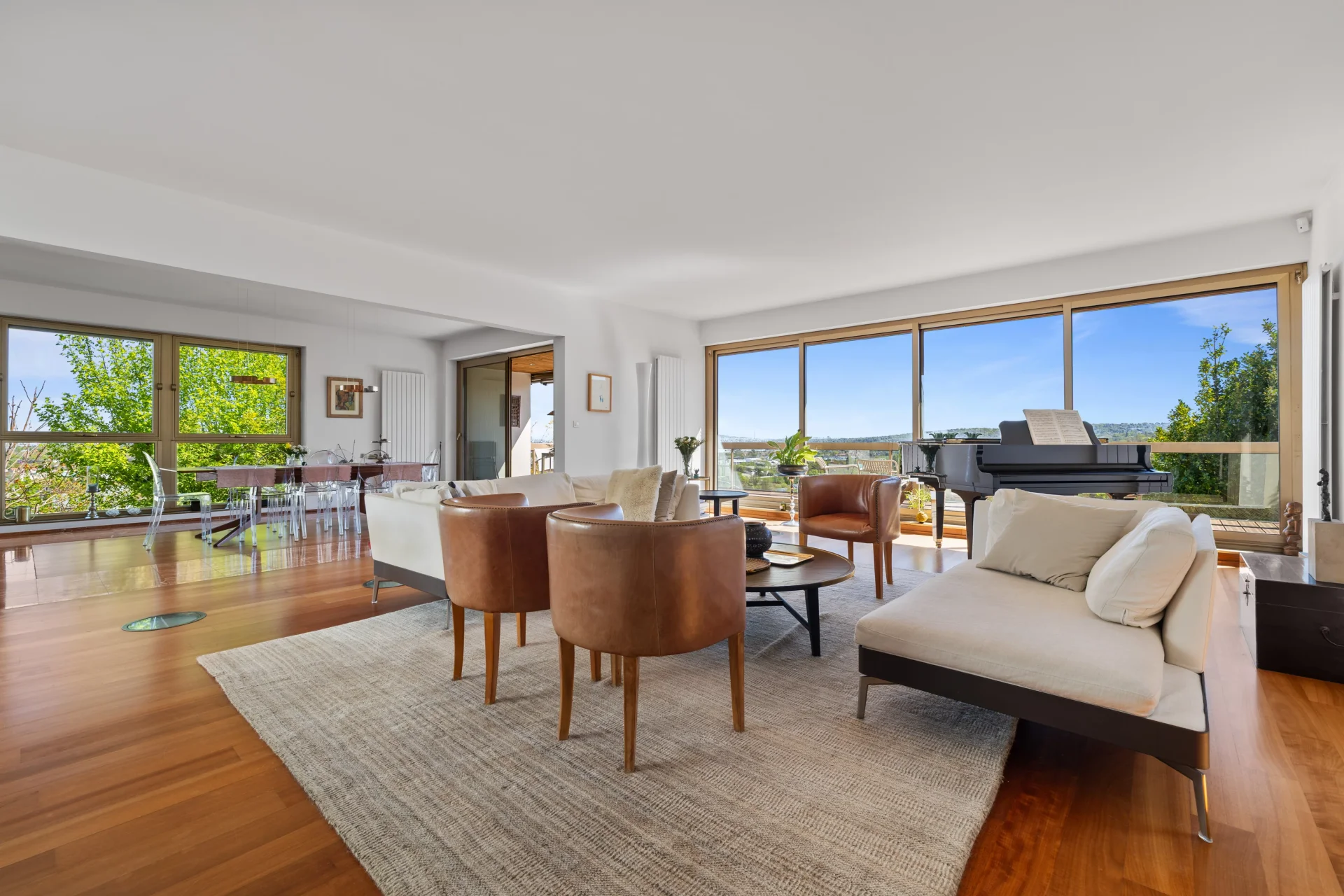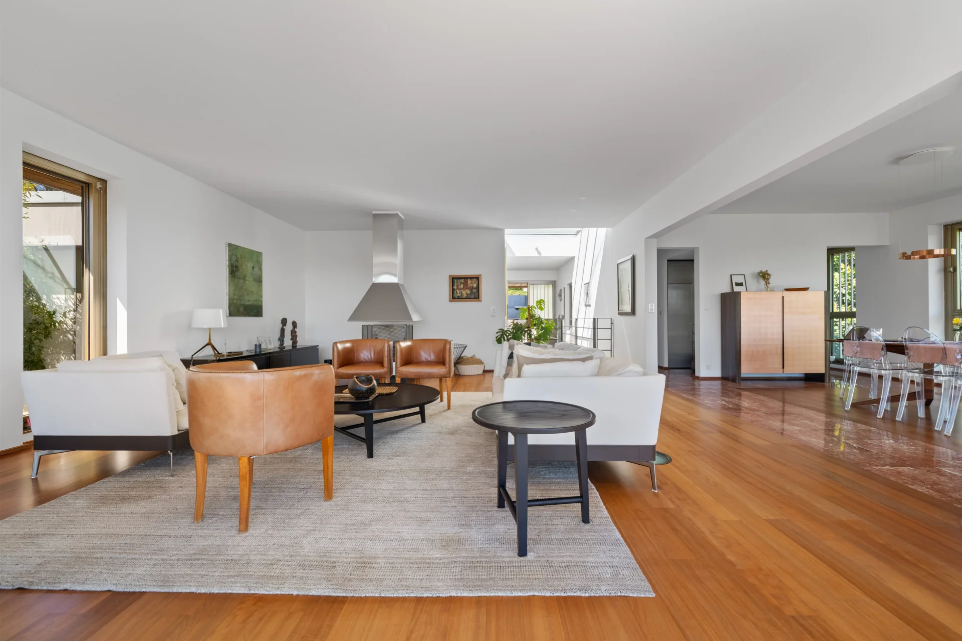 Les espaces de réception, aux proportions généreuses, s’ouvrent largement sur l’extérieur grâce à de vastes baies vitrées, offrant une luminosité traversante et une parfaite continuité avec les terrasses et le jardin.