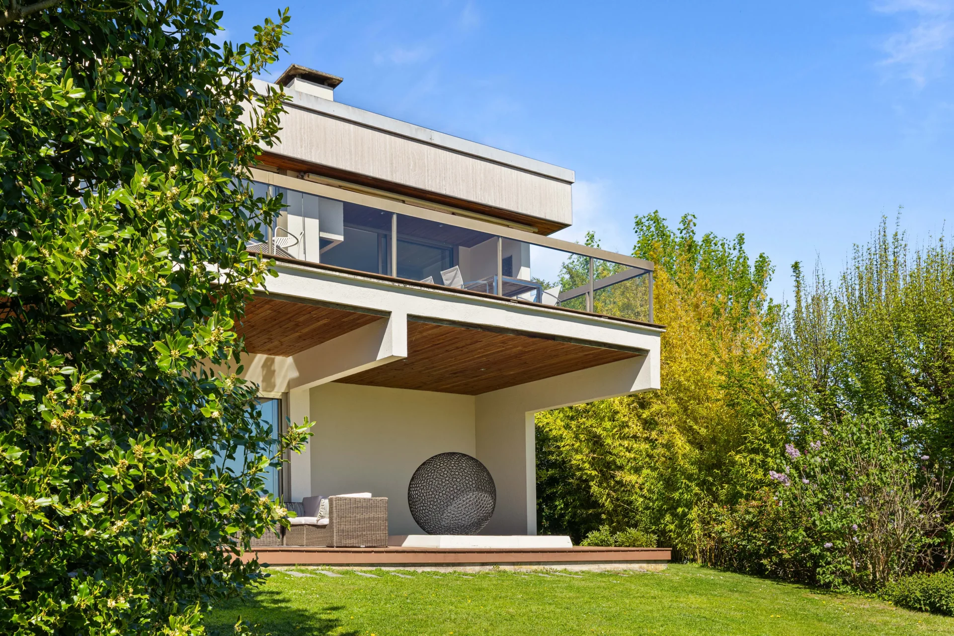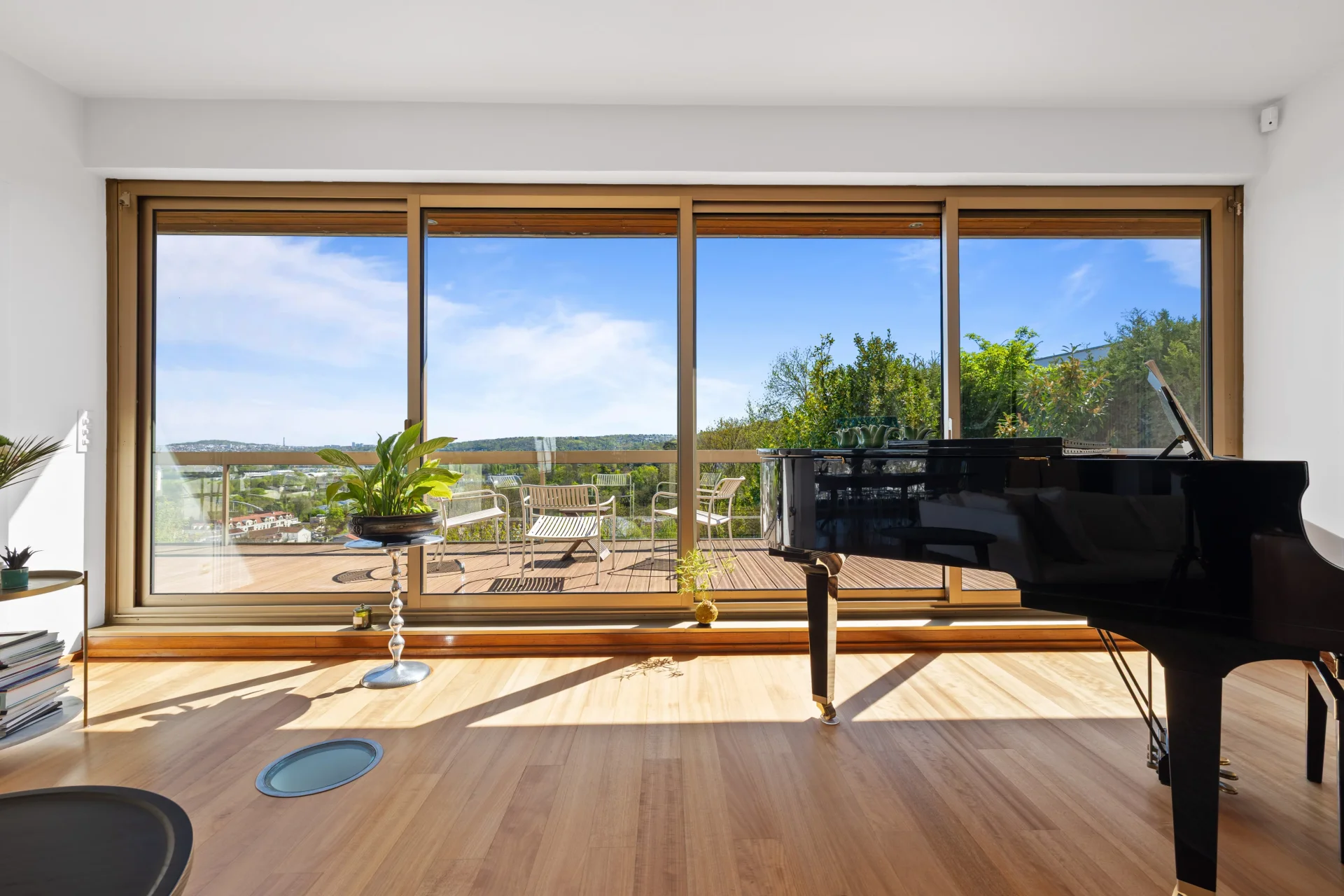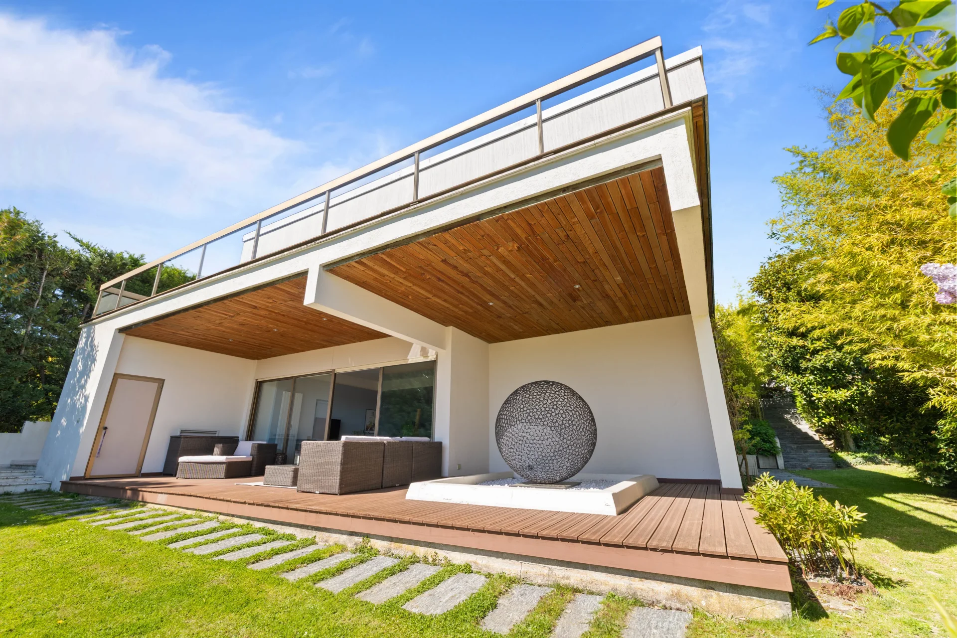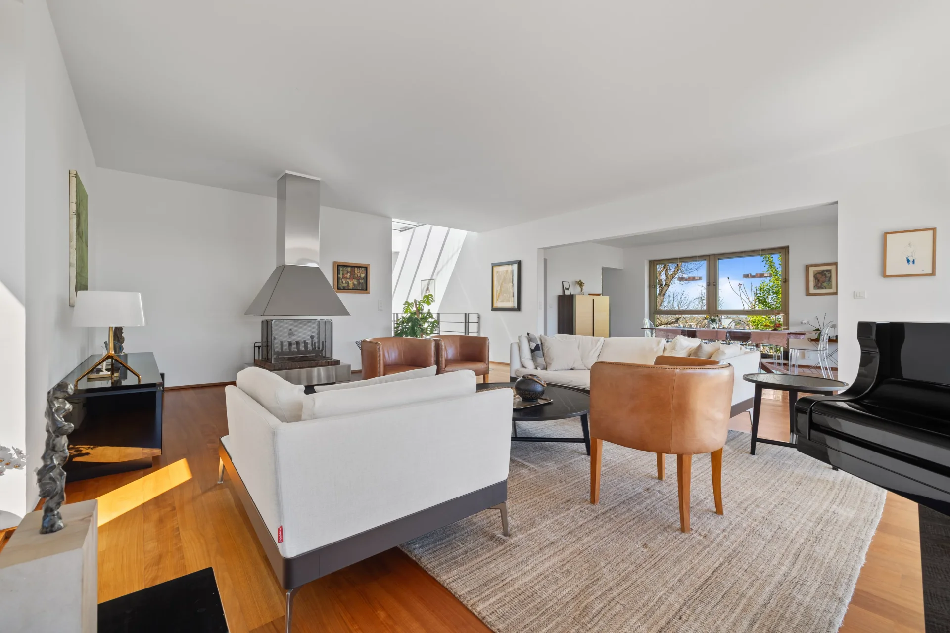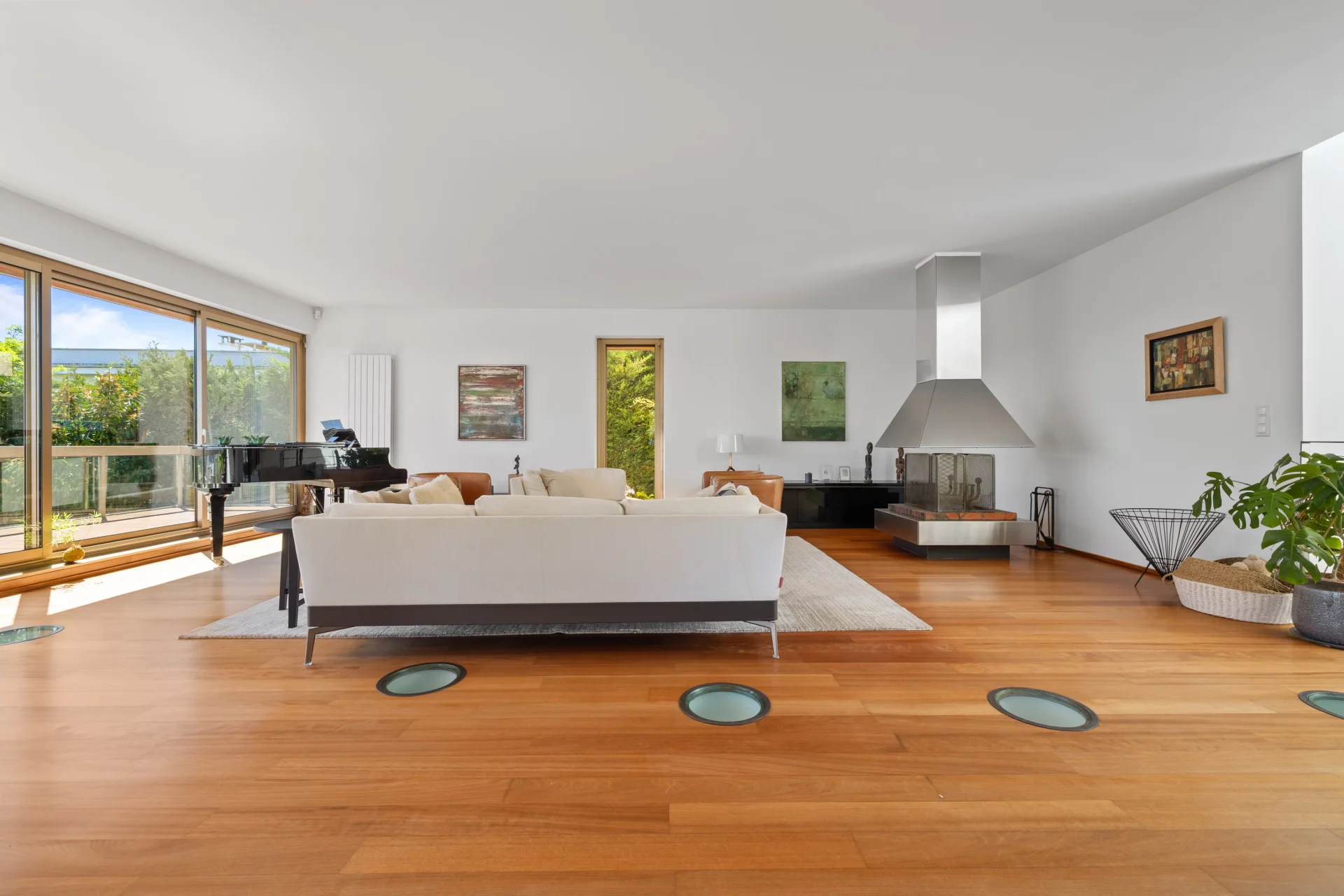 Les espaces de réception, aux proportions généreuses, s’ouvrent largement sur l’extérieur grâce à de vastes baies vitrées, offrant une luminosité traversante et une parfaite continuité avec les terrasses et le jardin.