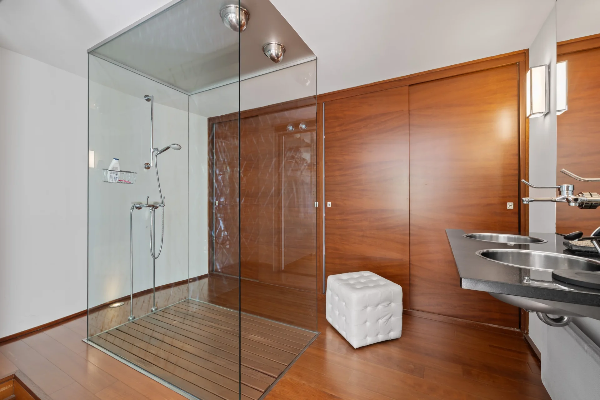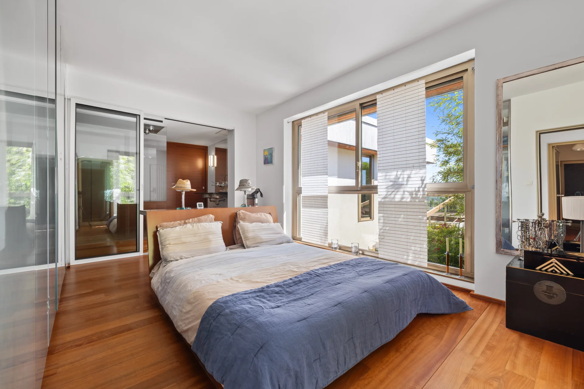 L’espace nuit propose cinq chambres, dont une suite parentale conçue comme une véritable œuvre architecturale, intégrant menuiseries sur mesure, jeux de lumière et salle de bains attenante.