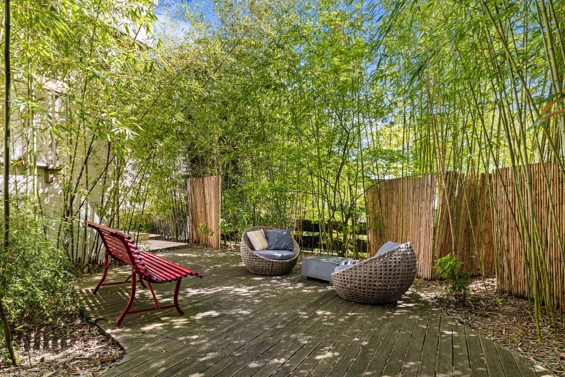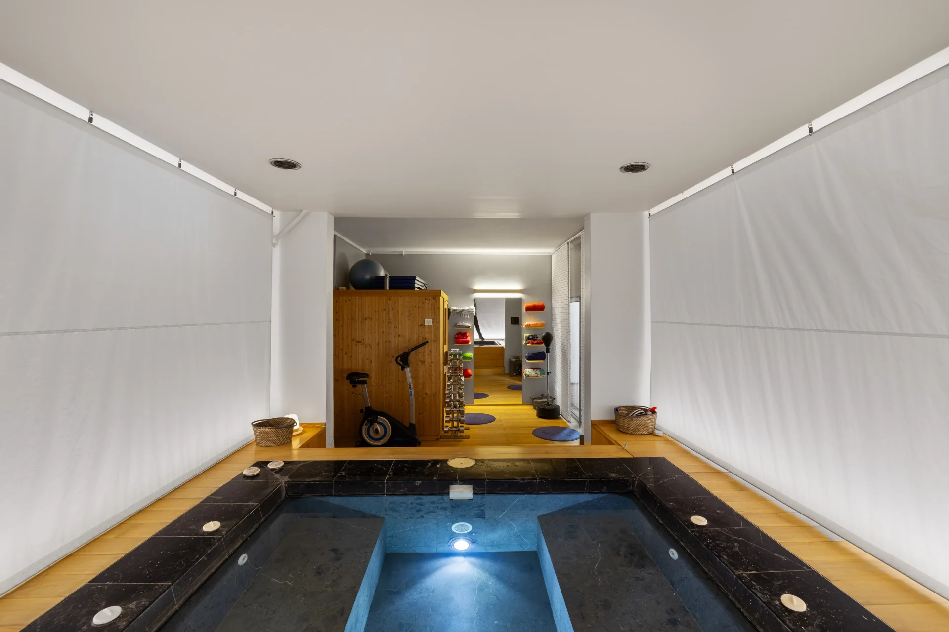 Dans le prolongement de cette réflexion autour du bien-être, la propriété dispose également d’un espace dédié avec spa, sauna et salle de sport, inspiré d’ambiances japonisantes, véritable havre de paix à domicile.
