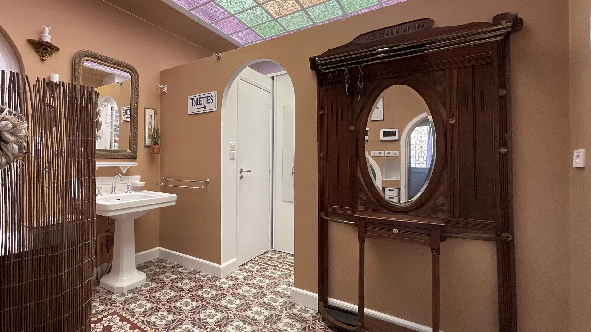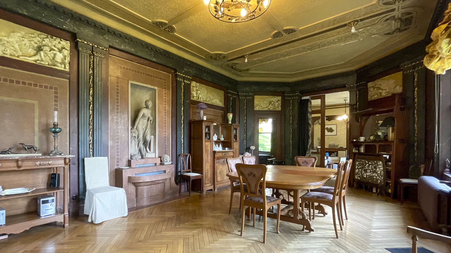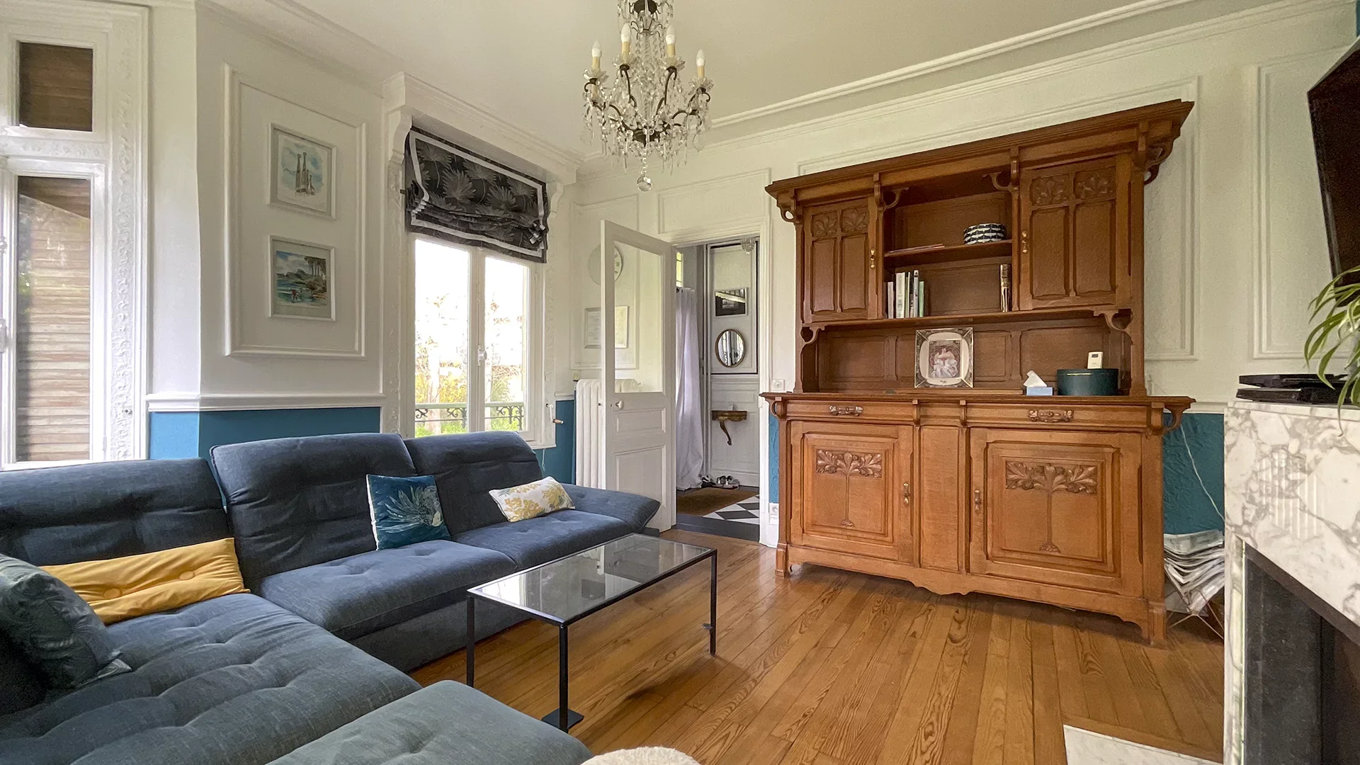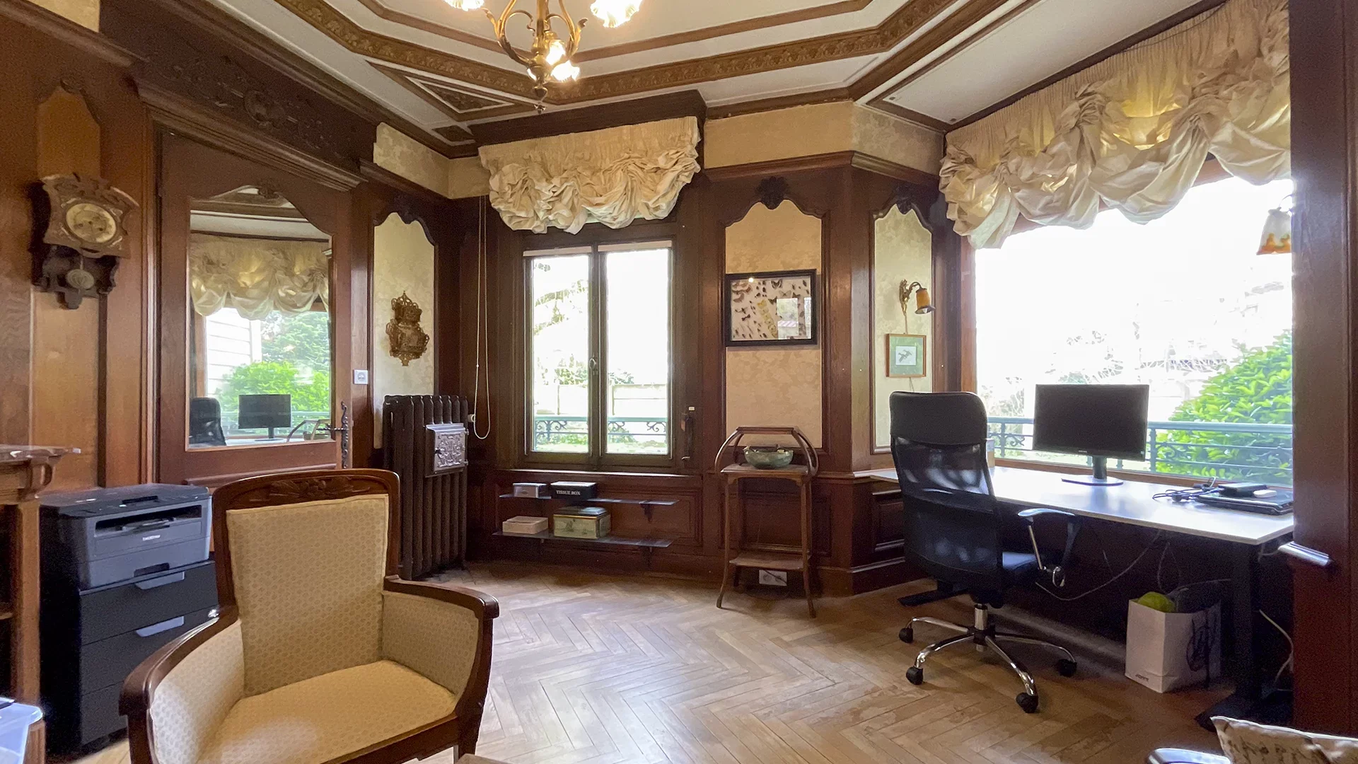 La maison s’ouvre sur une belle entrée desservant, à gauche, un bureau raffiné avec boiseries anciennes, prolongé par une remarquable salle à manger aux prestations uniques : mur entièrement habillé de miroirs, boiseries d’époque, ancienne fontaine et plafonds d’exception. À droite, un salon chaleureux agrémenté d’une cheminée avec insert.
