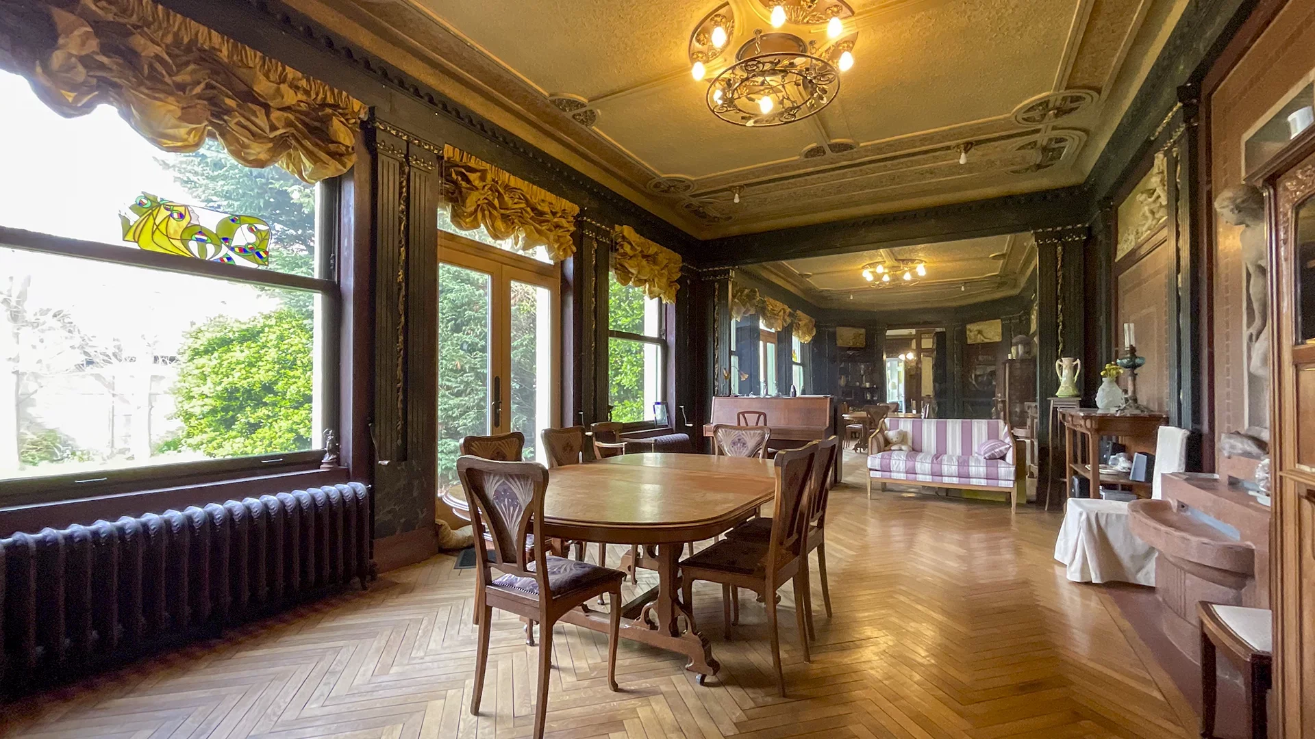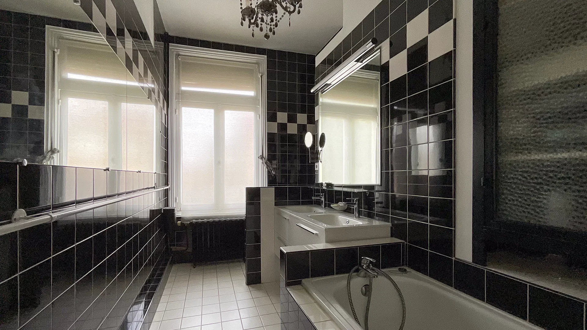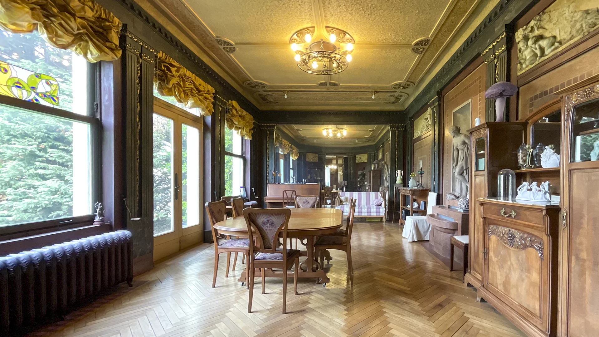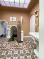 La maison s’ouvre sur une belle entrée desservant, à gauche, un bureau raffiné avec boiseries anciennes, prolongé par une remarquable salle à manger aux prestations uniques : mur entièrement habillé de miroirs, boiseries d’époque, ancienne fontaine et plafonds d’exception. À droite, un salon chaleureux agrémenté d’une cheminée avec insert.