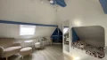 Au premier étage, vous trouverez une grande chambre, une chambre pouvant faire office de bureau ainsi qu’une salle de bains. Le second étage accueille deux chambres mansardées pleines de charme.