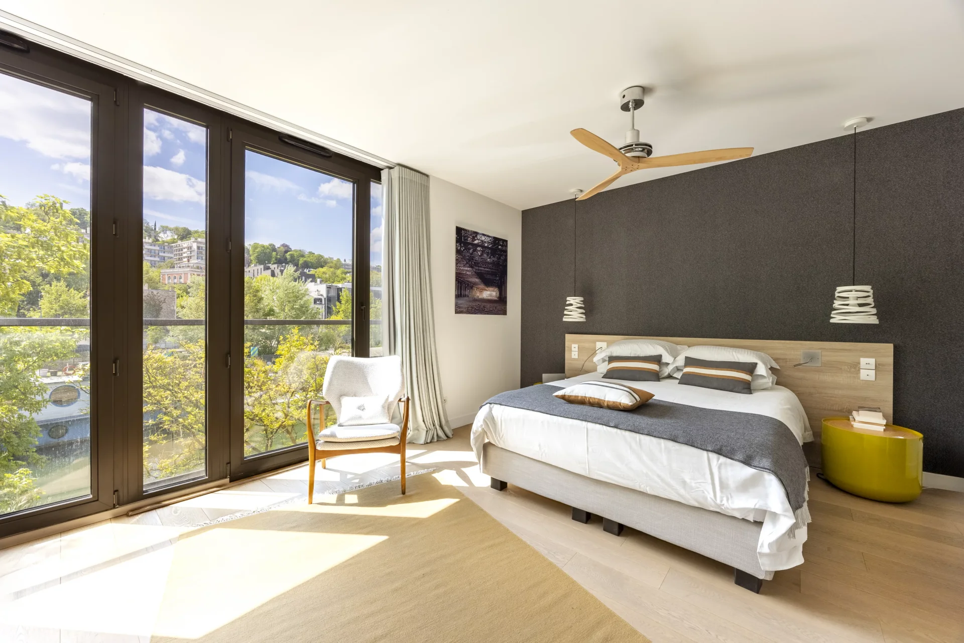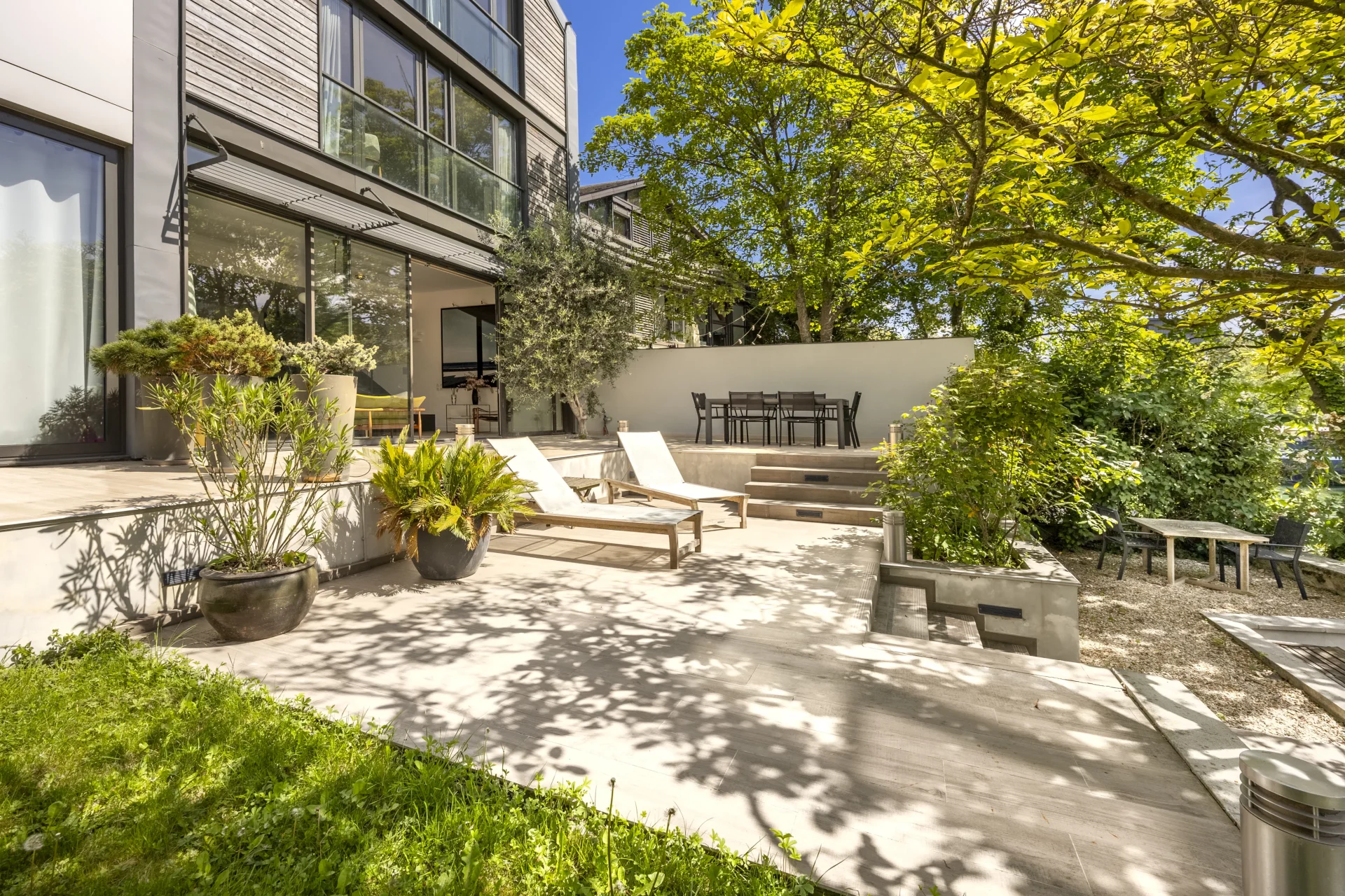 Imaginée par architecte en 2015, cette villa offre un séjour aux volumes exceptionnels et baigné de lumière ouvert sur une grande terrasse plein sud, un jardin arboré et son ponton privé. Une cuisine équipée Bulthaup et des toilettes invités complètent ce niveau.