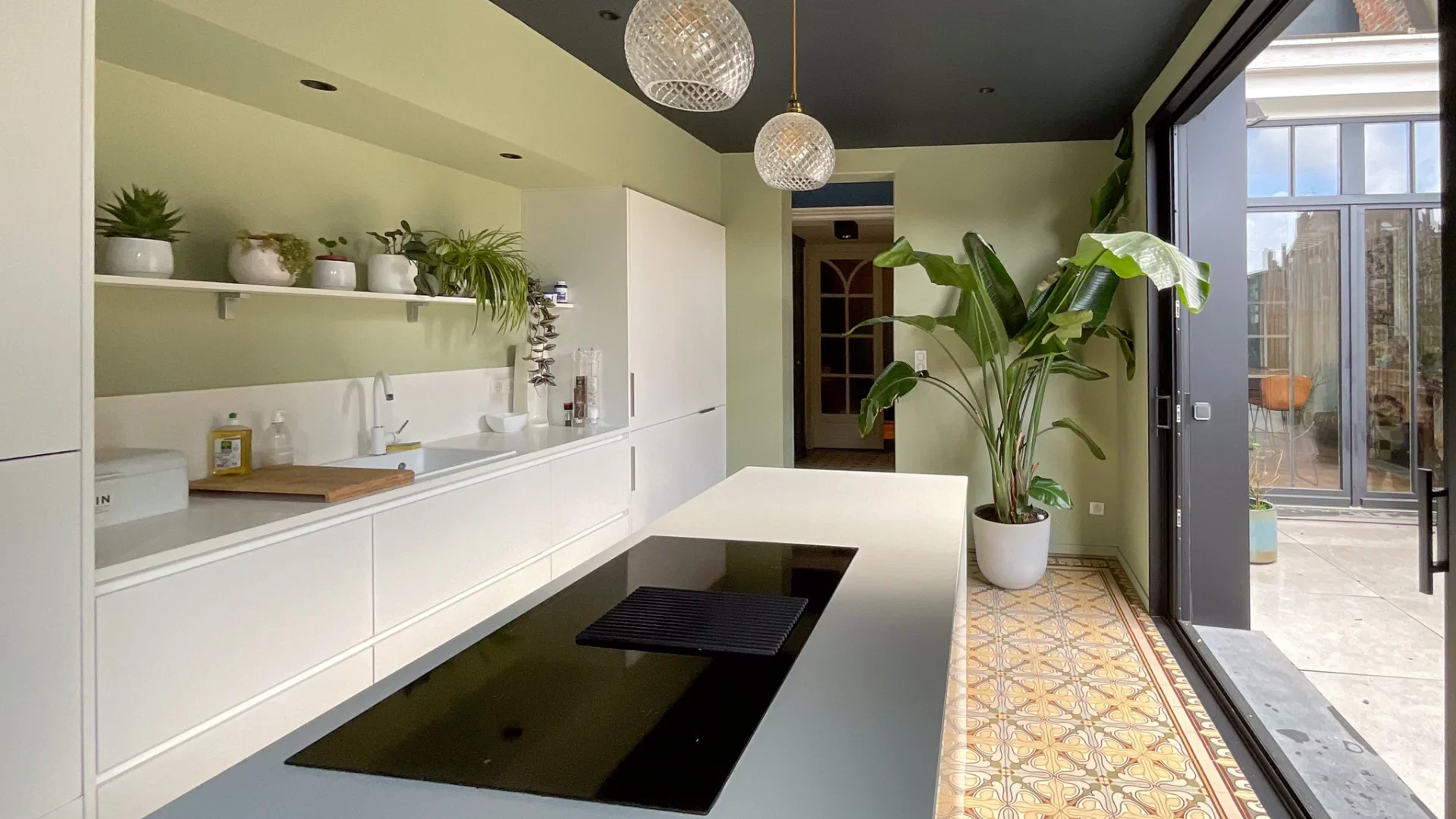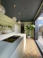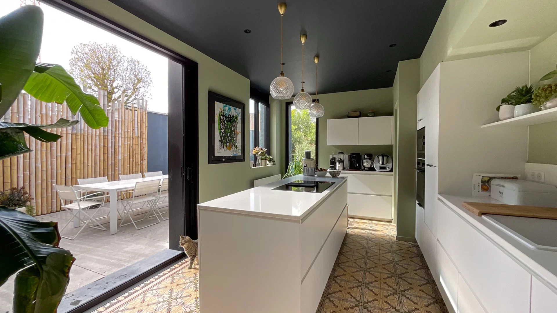 La cuisine prolongée par un cellier s’ouvre sur une grande terrasse de 60m² surplombant le jardin.
