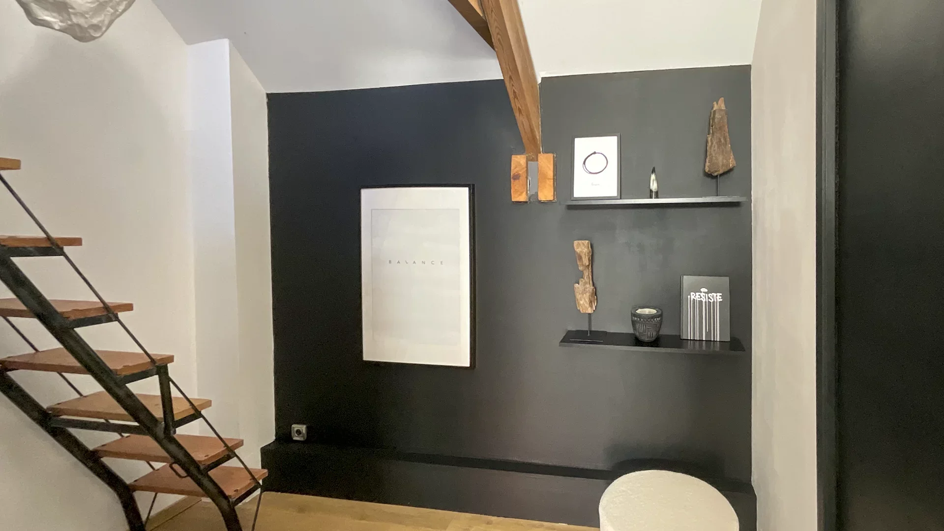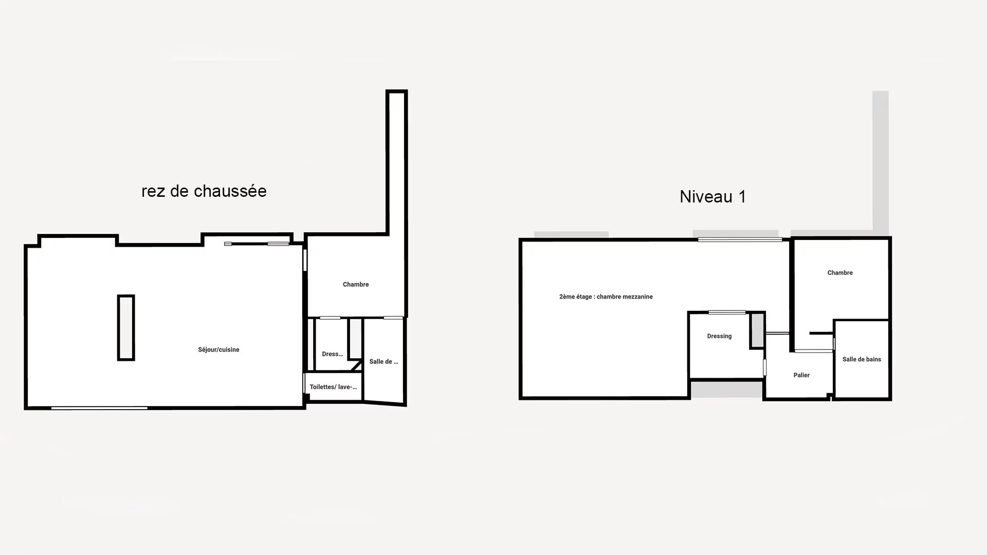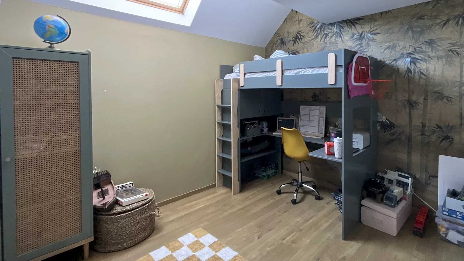 Au premier étage, le palier dessert une chambre, une salle de bains et un second dressing (ou chambre complémentaire). Au second étage, vous découvrez une dernière chambre avec coin bureau en mezzanine.