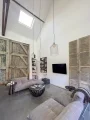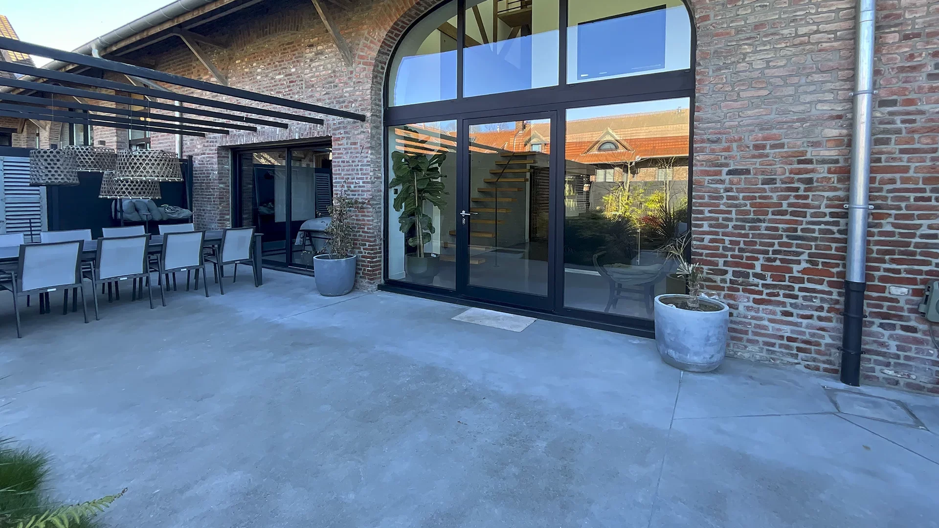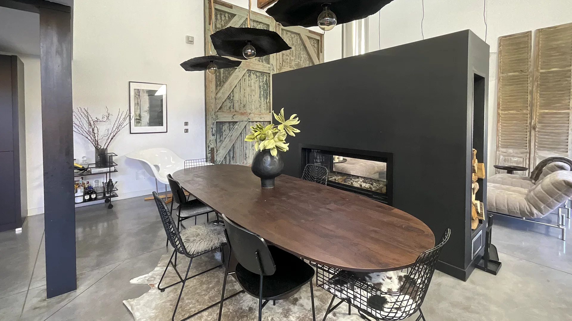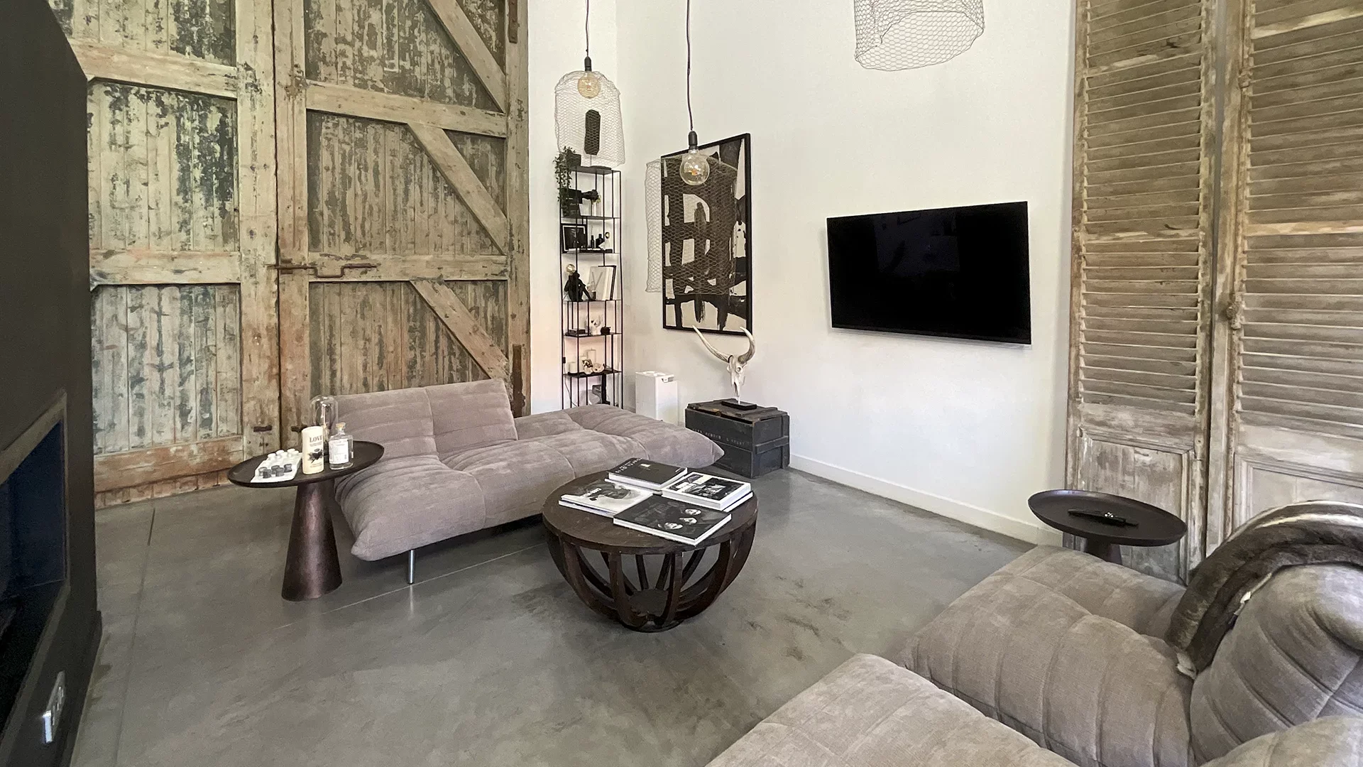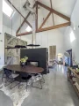 Dans une ancienne ferme en U divisée, cette maison a été entièrement rénovée et offre dès l’entrée dans la pièce de vie un volume extraordinaire : 75m² avec une hauteur sous plafond de 8m et une majestueuse cheminée centrale pour réchauffer le tout.