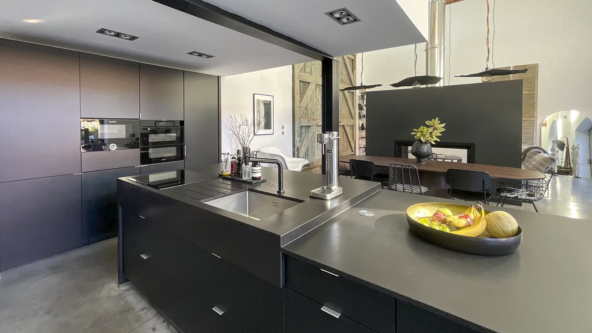 La cuisine équipée est ouverte sur cet ensemble salon/ salle à manger et invite à des moments conviviaux au quotidien.