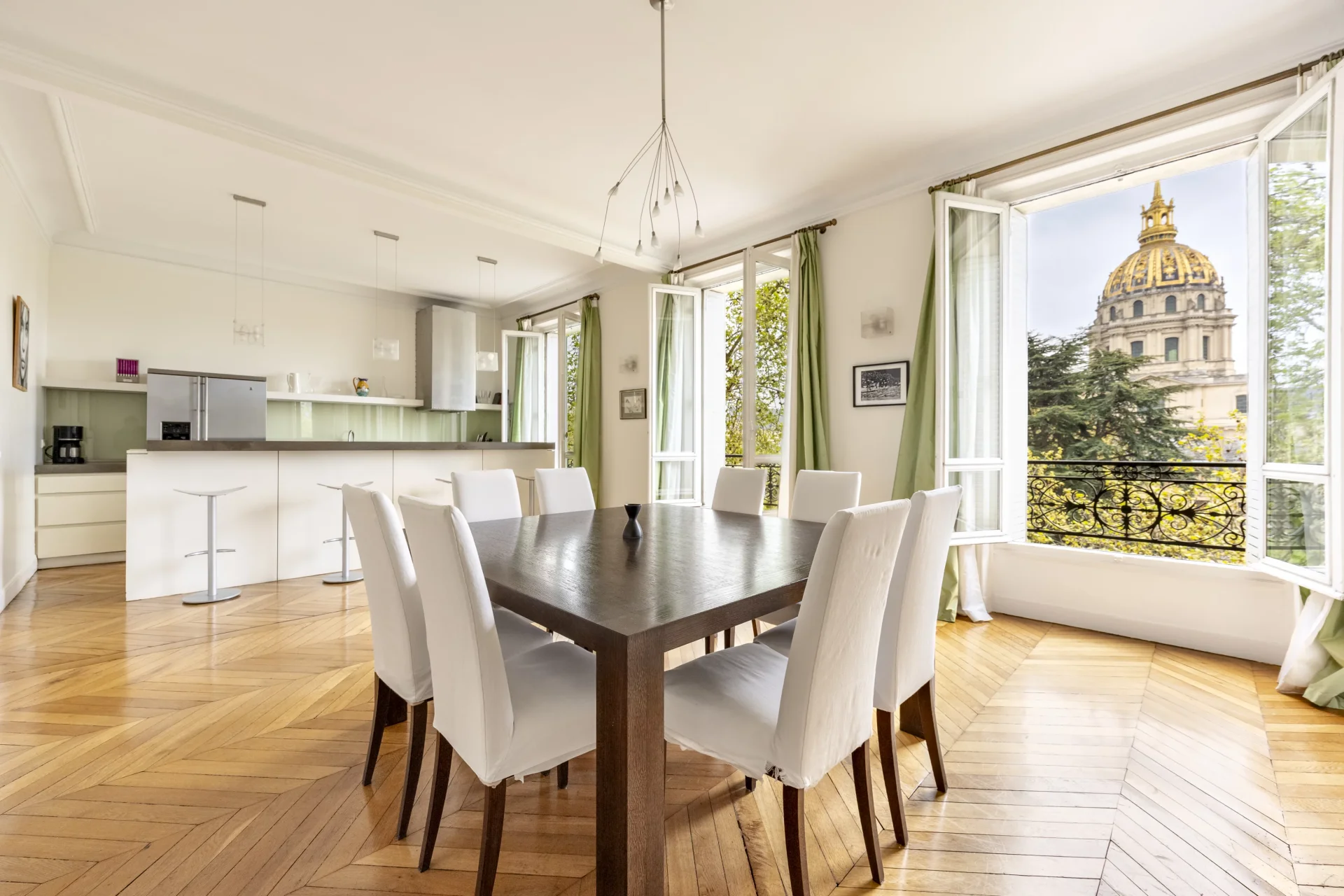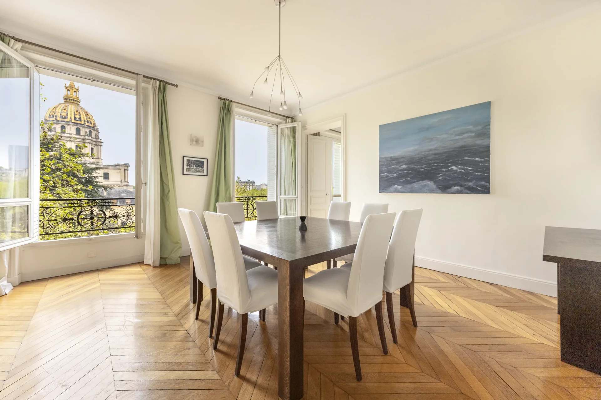 Il comporte une entrée donnant sur un beau séjour lumineux avec vue sur les Invalides, une salle à manger donnant sur une cuisine dînatoire aménagée et équipée, trois belles chambres avec rangements, une salle de bains avec toilettes ainsi qu'une salle de douche avec toilettes.