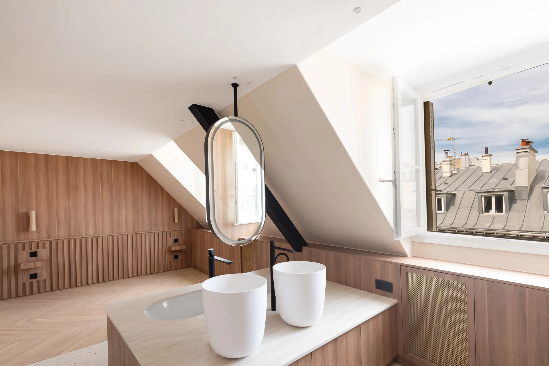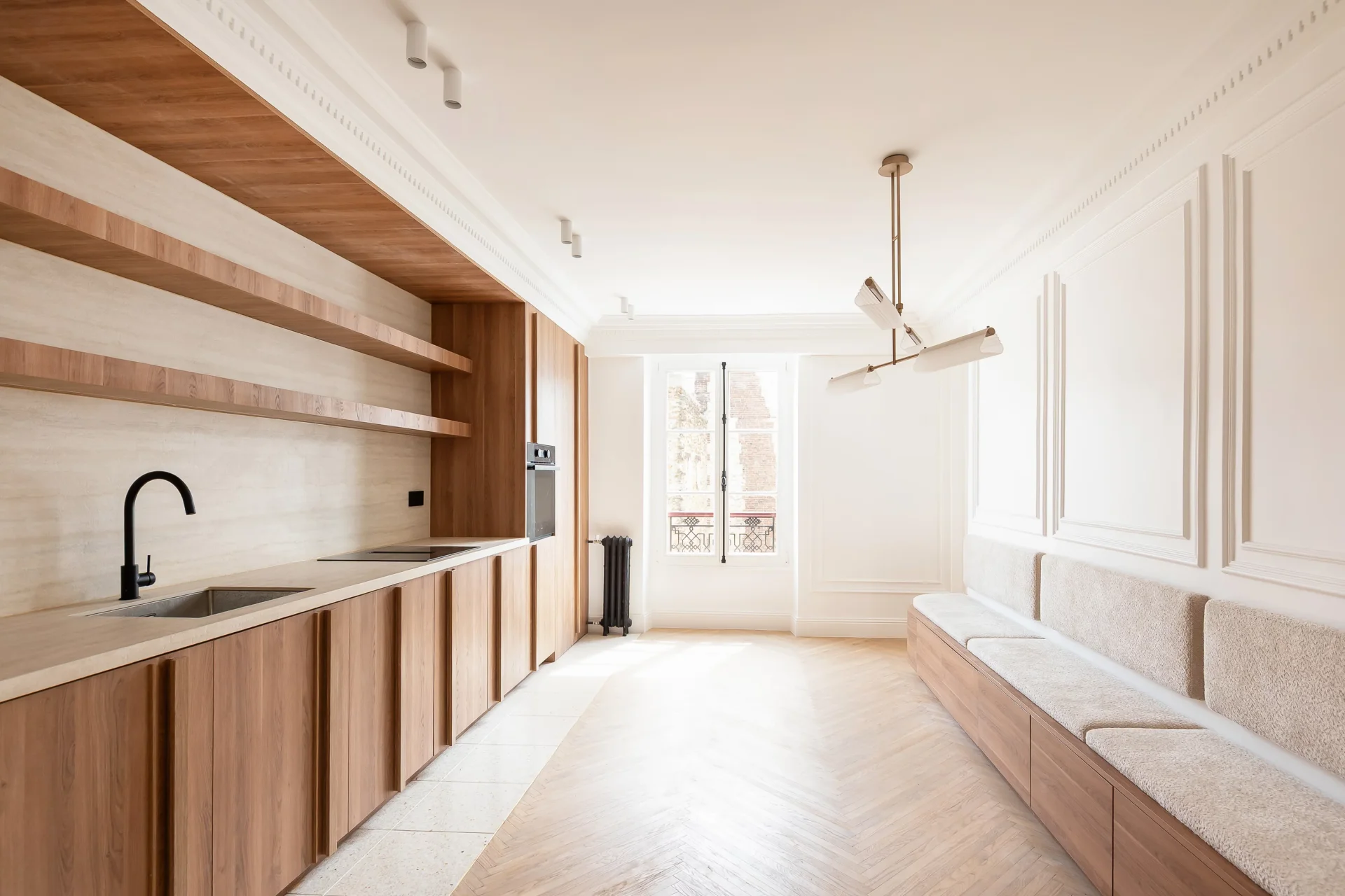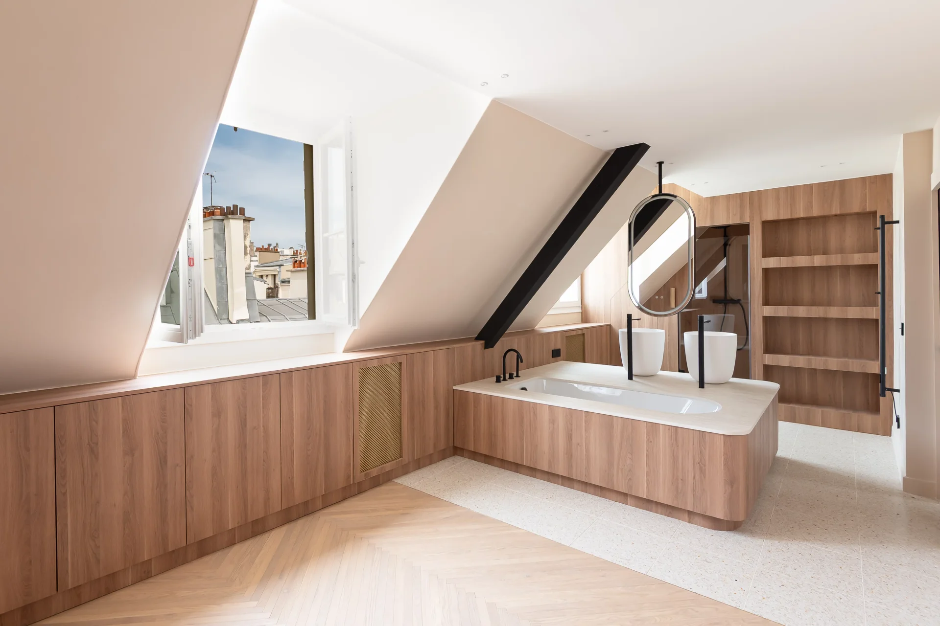 Rare. Au sixième et dernier étage par ascenseur d’un bel immeuble ancien avec gardienne à demeure, magnifique appartement de 81,65m² loi Carrez refait à neuf avec goût et matériaux haut de gamme.