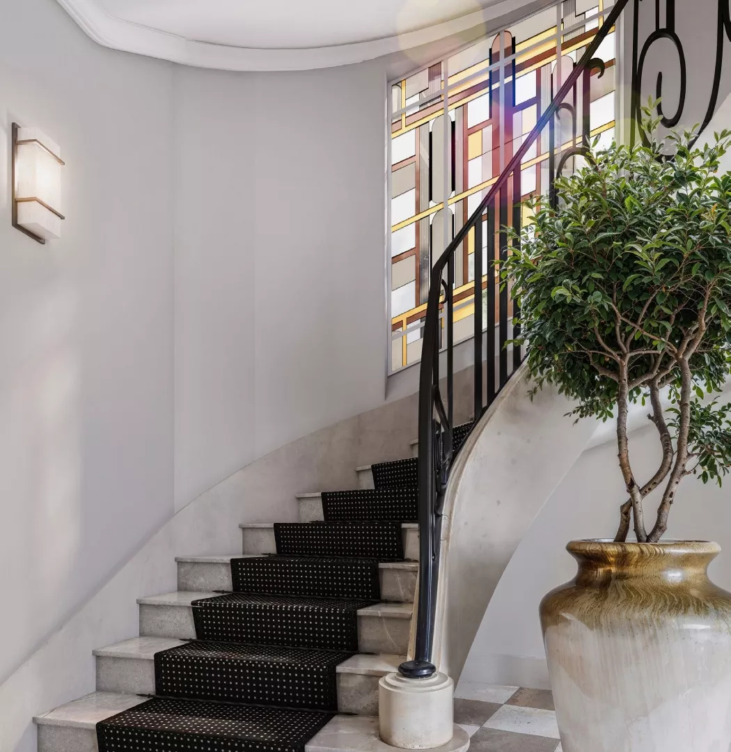 Symbole de l’âme Art Déco du 1930, l’escalier monumental retrouve la noblesse de sa pierre et la finesse de son fer forgé, sublimés par un tapis d’origine délicatement conservé.
