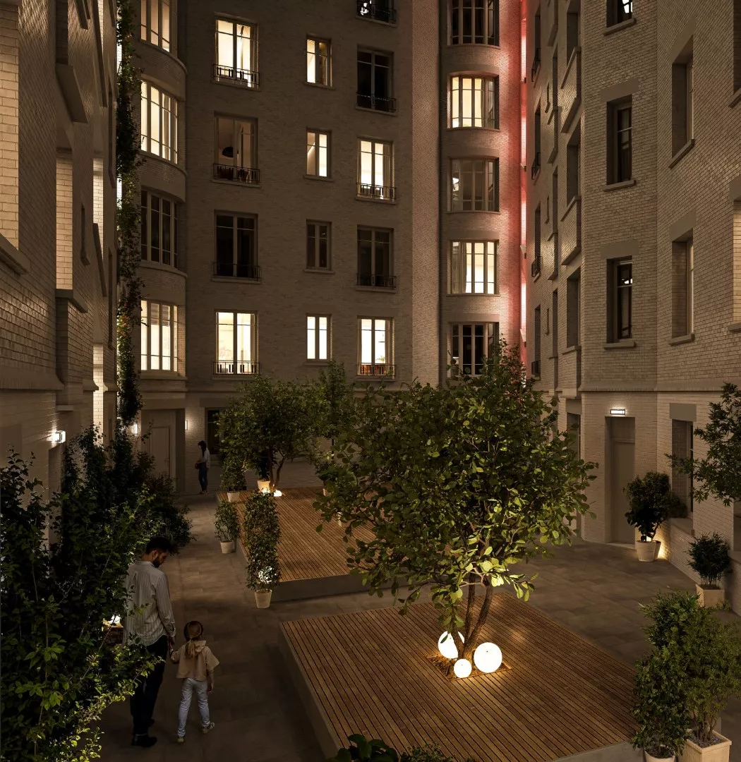 Trois murs végétaux habillent les anciens escaliers de service, et des jardins privatifs prolongent certains appartements. Une composition paysagère qui transforme chaque retour chez soi en une respiration. -